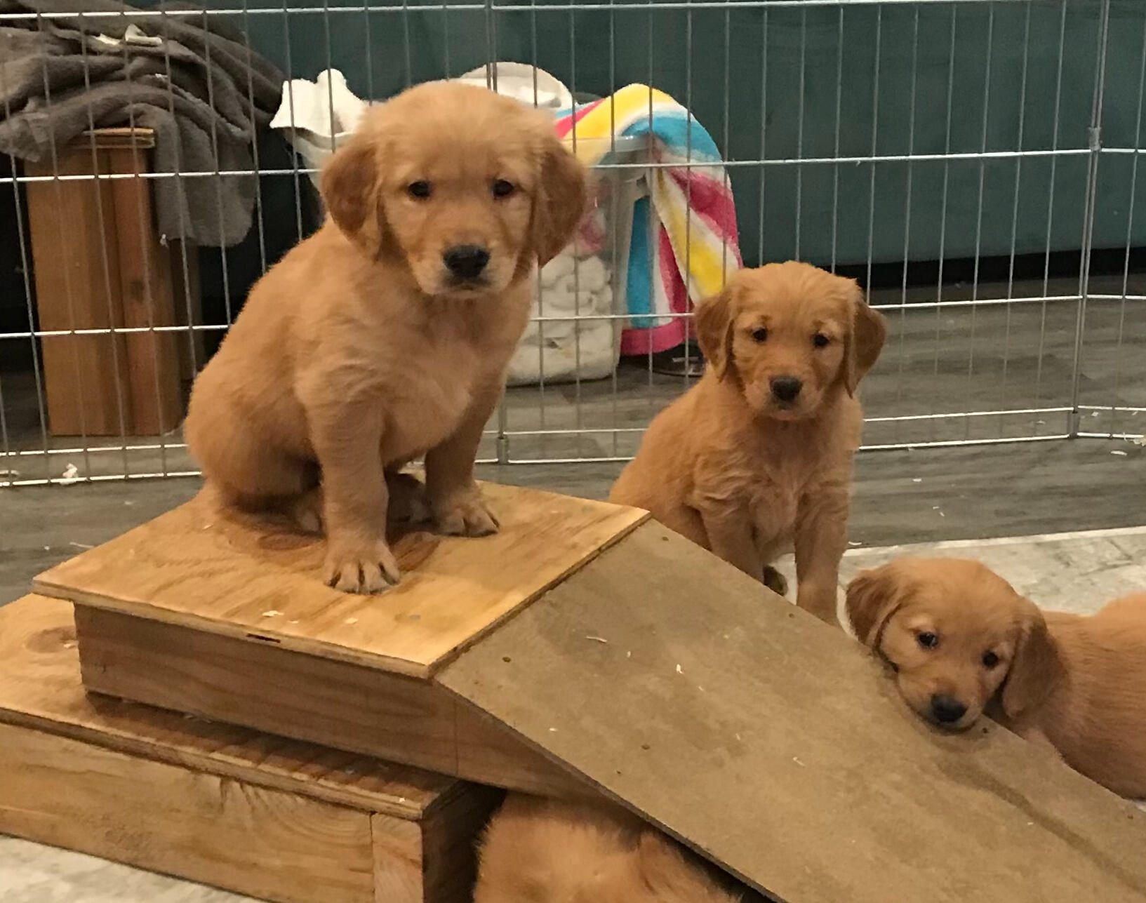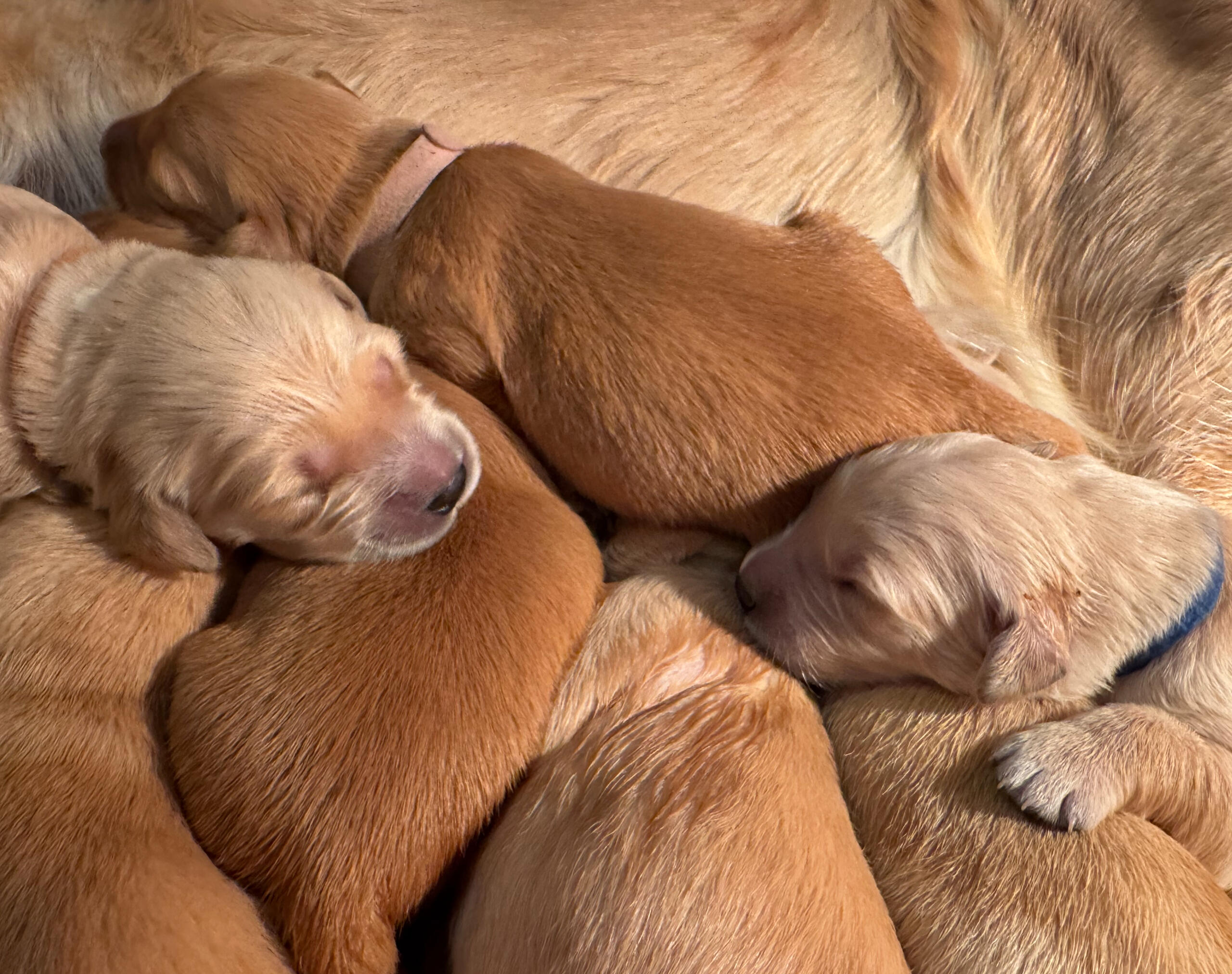 Born June 22 • Go Home August 17–19Athletic, light-shedding Goldens with gorgeous middle-golden, dark and light coats with smaller frames — expected adult weight 60–70 lbs. Raised in our home with love, early socialization, and a focus on healthy starts.